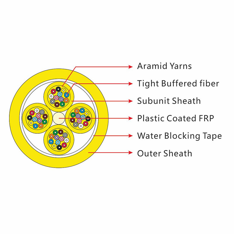 O cabo de distribuição multiuso GJPFJV utiliza subunidades de 6 fibras ((buffer apertado de 900um, fio de aramida como membro de resistência).Um plástico reforçado com fibras (ERP) localiza-se no centro do núcleo como um membro de resistência não metálicoAs sub-unidades estão encalhadas ao redor do núcleo do cabo. O cabo é completado com uma jaqueta LSZH ou PVC. com materiais de bloqueio de água de tipo seco entre a fibra e a bainha.